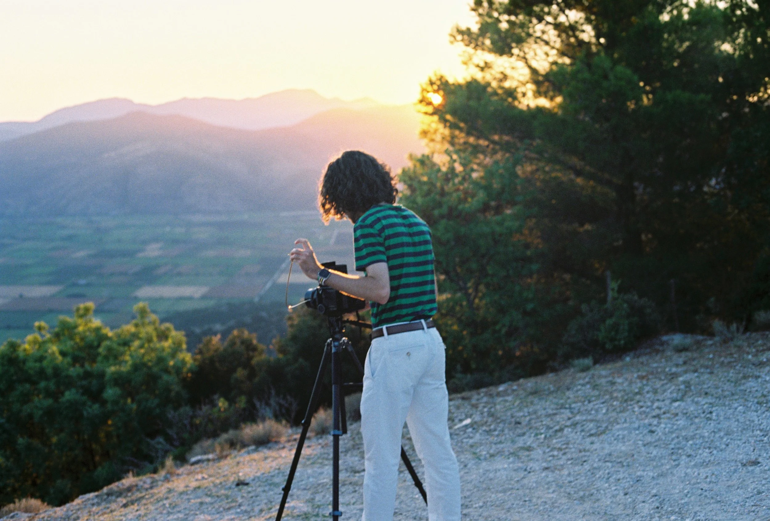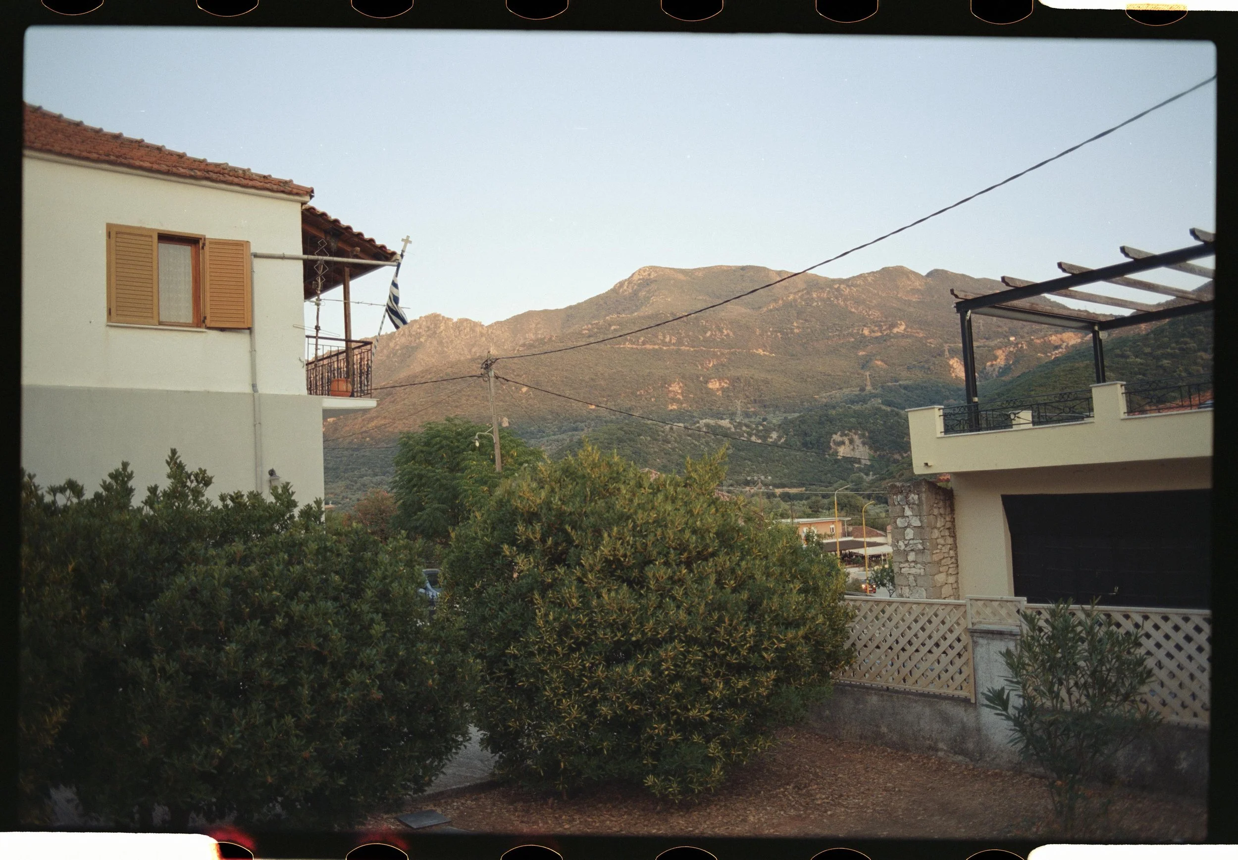 Was man eigentlich gar nicht beschreiben kann, ist dieses Licht. Dieses goldene Licht in Griechenland – sowas gibt es in Deutschland einfach nicht. Alles wird dadurch viel intensiver, alles bekommt so eine tolle Farbe. Besonders auf Film sieht es einfach extrem geil aus und vermittelt genau diese Atmosphäre, die ich meine. Es ist so ein tiefes Gold, ein Orange, ein Gelb, das sich über alles legt. In diesem Moment bekommt alles eine super warme, tolle Stimmung. Alles leuchtet, alles wird schön und die Zeit bleibt für einen kurzen Moment stehen. Man vergisst alles um sich herum. Die Texturen treten hervor, die Schatten werden super lang. Die Landschaft, die Felsen, die Pinien und der Oleander – diese pinken Blumen leuchten dann fast lila. Die Orangen in den Feldern oder die Zitronen, alles strahlt so krass. Von unserem Haus aus kann man beobachten, wie dieses Licht langsam die Berge hochzieht und alles in dieses warme Glühen taucht. Es ist unbeschreiblich, man muss es einfach gesehen haben.