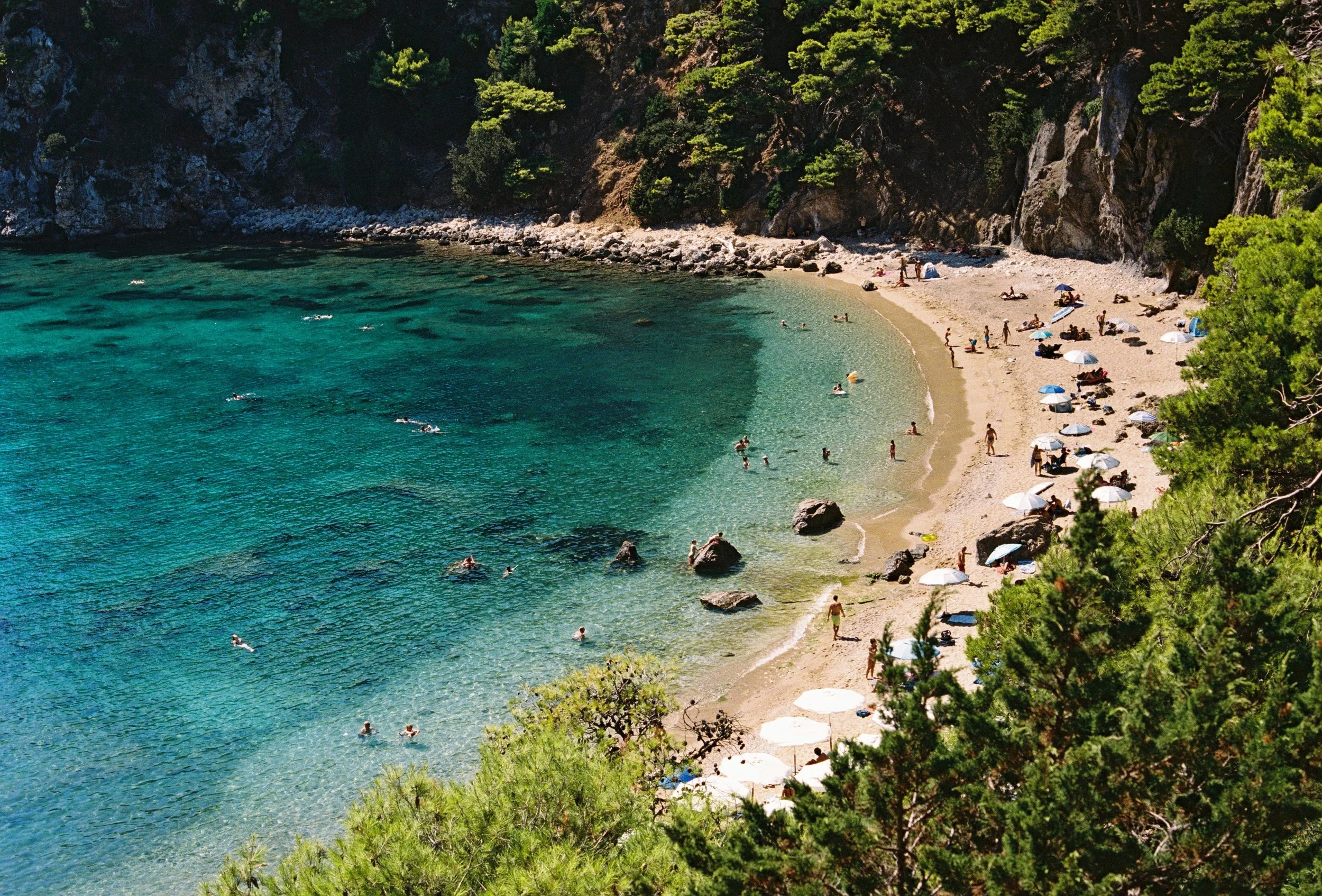 Die Strände in Griechenland sind bekannterweise traumhaft. Von unserem Dorf aus sind es etwa 20 Minuten bis zur Küstenregion. Man fährt eine wunderschöne Route über die Landstraße durch zahlreiche Dörfer, die wir wahrscheinlich noch nie besucht haben. An der Küstenregion hat man dann eine Auswahl von vier verschiedenen Stränden, alle mit ihrer eigenen Charakteristik. Loutsa ist ein sehr schöner Strand zum Liegen und Lesen, er ist etwas touristenintensiv. Es ist immer sehr voll zur Hauptsaison und er ist sehr, sehr lang. Der Vorteil ist, dass man zwischen sehr vielen Lokalen auswählen kann, welche immer sehr viele Liegen am Strand anbieten. Wir haben unseren Stammplatz seit sehr vielen Jahren. Es gibt Fotos von mir als Kind in Loutsa – ich bin immer wieder erstaunt, das ganze Grün auf dem Hang zu sehen. Heute ist alles zugebaut. Das ist eben die Entwicklung, die durch den Tourismus entstanden ist. Ich werde später noch schreiben, wo mich diese Entwicklung besonders getroffen hat. Dann gibt es noch die Strände Alonaki, Skala und Ammoudia. Skala und Alonaki sind meine Lieblingsstrände. Es sind eigentlich reine Naturstrände. Hier ist nichts künstlich aufgeschüttet worden. Alles ist so, wie die Natur es geschaffen hat; das Wasser ist klar und hellblau und es ist umgeben von einer wundervollen Küstenlandschaft. Ammoudia ist ein sehr flacher Strand. Hier braucht es einige Minuten durch das Wasser, bis man nicht mehr stehen kann. Aber auch hier ist es sehr touristisch und es wirkt nicht wie ein Naturstrand.